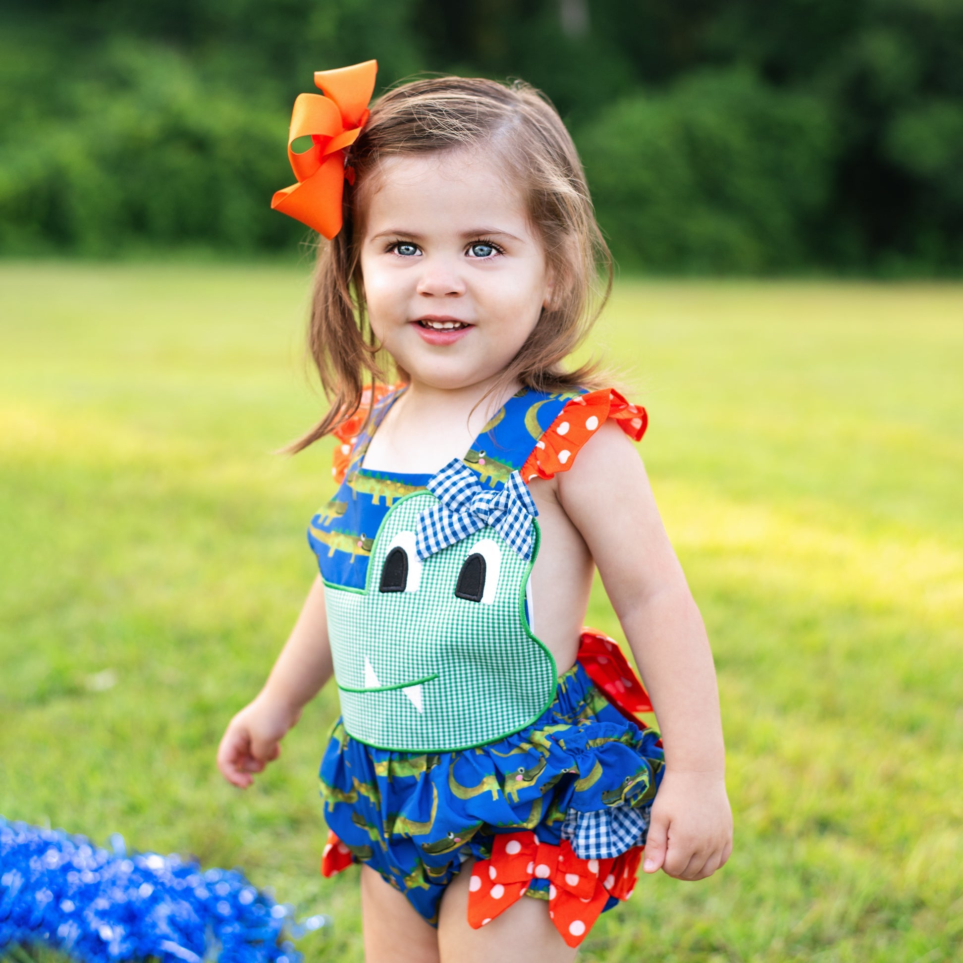 Be GameDay ready for Saturdays in the South with our Gator Bubble. This bubble features our custom designed Gator GameDay print by the talented Katherine Herrell Studio. Adjustable criss-cross straps button in the back.