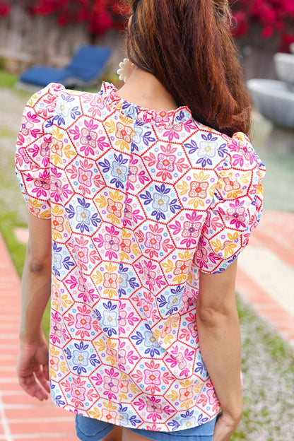 Beautiful You Ivory Floral Lace Frill Notch Neck Puff Sleeve Top